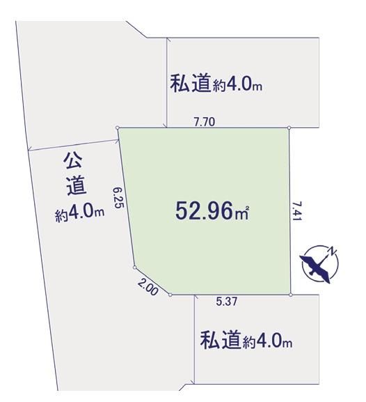 | 物件用途 | - | 接道 | 公道 南西 幅員4m 私道 北西 幅員4m 私道 南東 幅員4m |